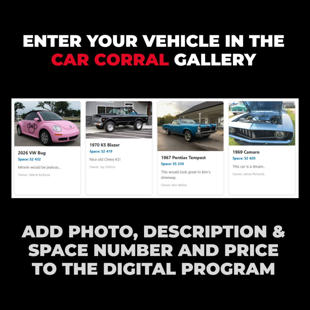Furthermore, to maximize visibility and buyer engagement, these important links will be advertised across the event’s social media channels, ensuring that the Car Corral inventory reaches thousands of motivated collector car shoppers before, during, and after the event.
